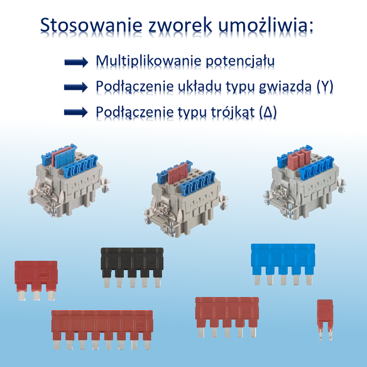 Zworki mogą być stosowane bezpośrednio na wkładach bez potrzeby stosowania dodatkowych komponentów lub skomplikowanych wiązek kablowych. Dostępnych jest wiele wersji mostków, które redukują miejsce instalacji oraz umożliwiają podłączenia w układach gwiazda lub trójkąt jak również mostkowanie potencjałów np. w połączeniach czujnikowych.