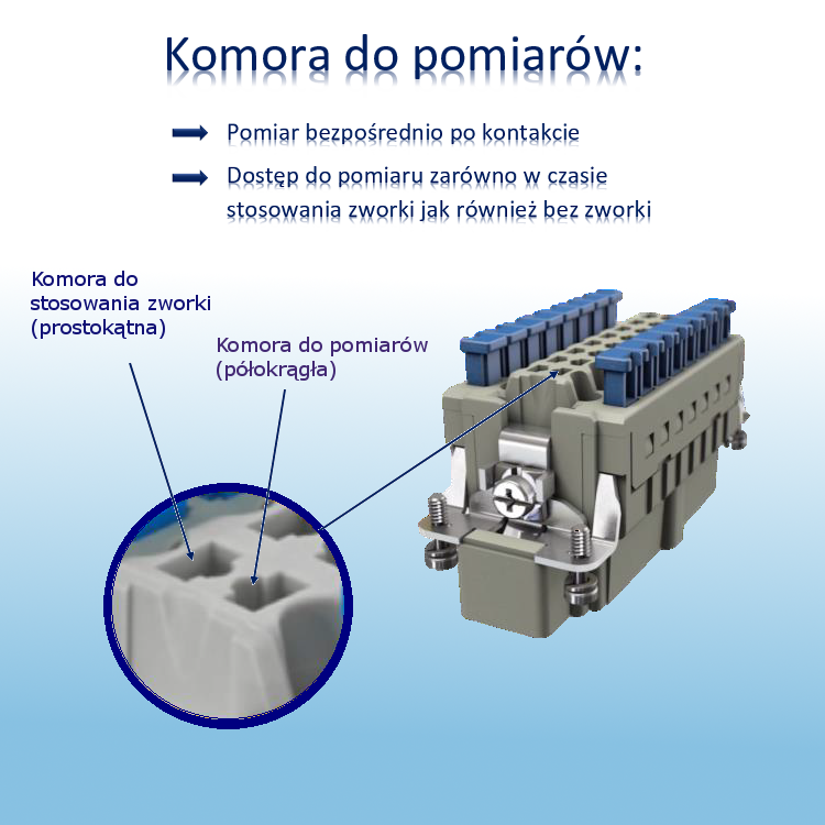 - dodatkowe funkcjonalności w porównaniu do dotychczasowych złączy: mostkowanie i pomiary,