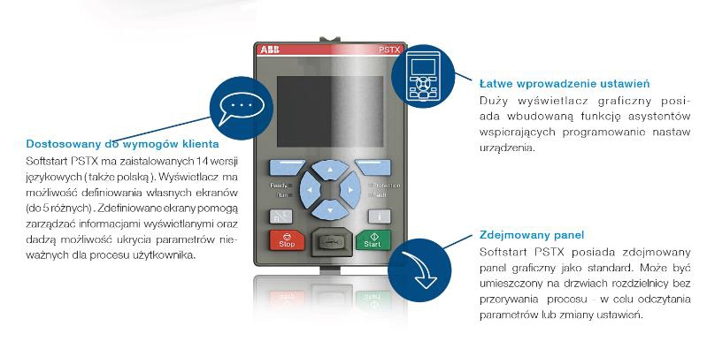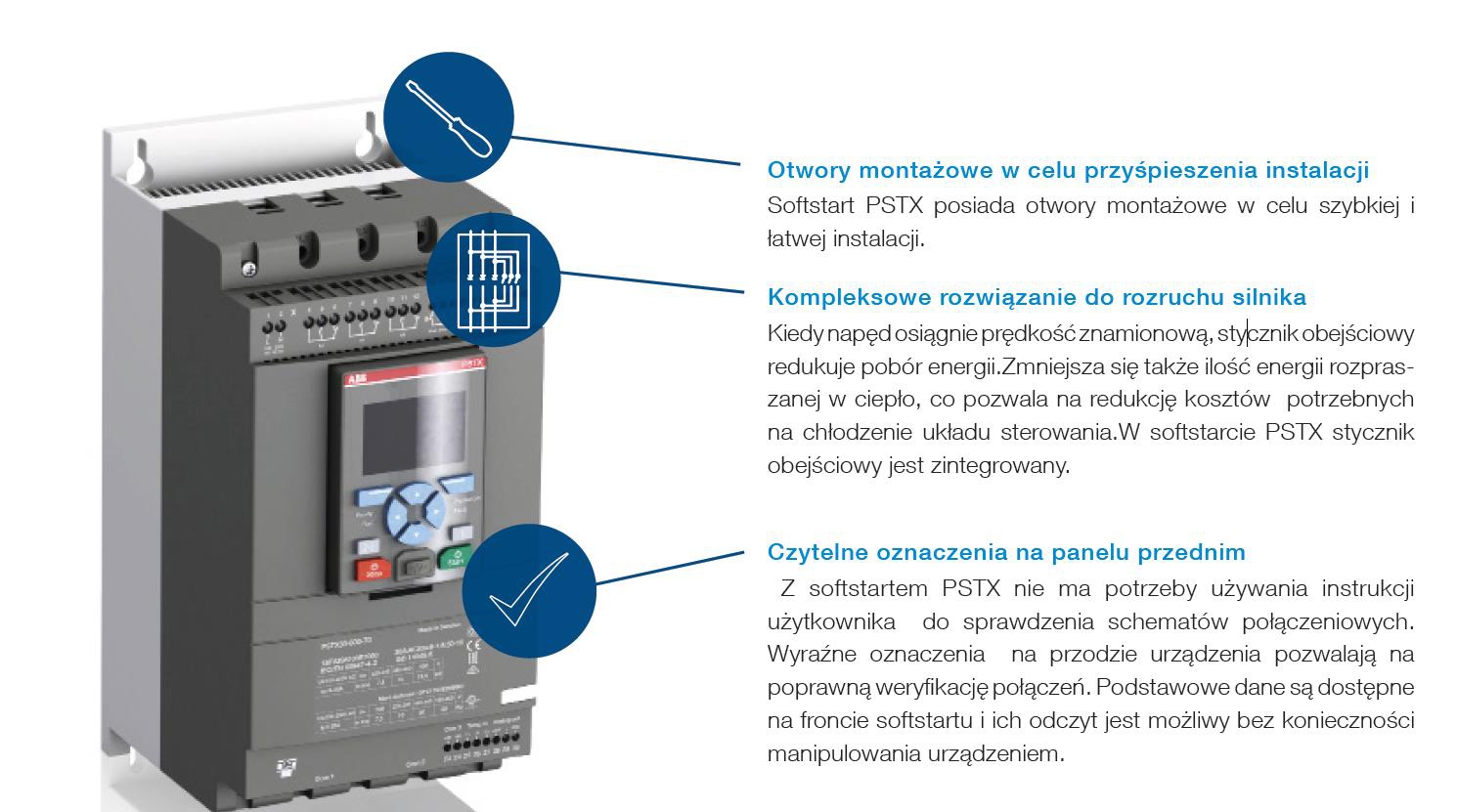 ABB poszerza swoją ofertę rynkową o nowe softstarty typu PSTX. Jest to grupa zaawansowanych technologicznie aparatów, wyposażonych w wiele użytecznych funkcji niezbędnych do pełnej optymalizacji rozruchu silnika asynchronicznego. Softstarty PSTX są przeznaczone dla silników napędzających rozmaite maszyny w różnych warunkach pracy. Doskonale współpracują z 3 fazowymi silnikami asynchronicznymi i posiadają pełną regulację 3 fazową zapewniającą możliwość zastosowania w tzw. wewnętrznym trójkącie. Aktualnie zakres mocy silników współpracujących z tym typem softstartów obejmuje jednostki do 200 kW / 400V AC.