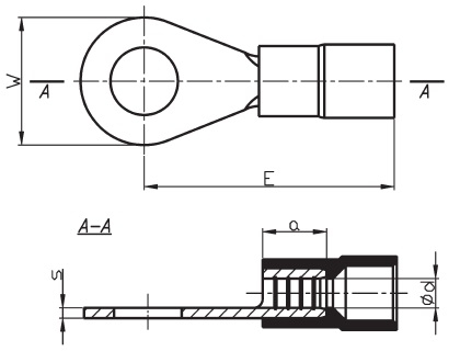 | końcówka oczkowa Cu w/g DIN z tulejką izolacyjną poliamidową oznaczona rozmiarem śruby i przekrojem przewodu na płetwie | |