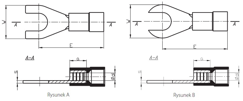 | końcówka widełkowa Cu w/g DIN z tulejką izolacyjną poliamidową oznaczona rozmiarem śruby i przekrojem przewodu na płetwie | |