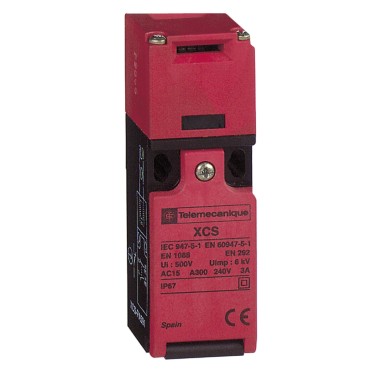Łączniki bezpieczeństwa kluczowe Preventa XCSPA firmy Telemecanique Senesors to proste w użytkowaniu wyłączniki krańcowe bezpieczeństwa z kluczem ryglującym, przeznaczone do pracy w układach sterowniczych bezpieczeństwa maszyn. Przeznaczone są do montażu na uchylnych, przesuwnych lub zdejmowalnych osłonach i pokrywach maszyn. Otwarcie osłony lub drzwi powoduje najczęściej odłączenie zasilania. Łączniki i klucze ryglujące są tak skonstruowane aby zabezpieczyć łączniki przed niekontrolowanym dostępem i przełączaniem zestyków przy pomocy prostych narzędzi. Wymiary korpusu 93,5 mm x 30 mm x 30 mm. Wyłączniki krańcowe bezpieczeństwa z kluczem ryglującym nadają się idealnie do monitorowania i ochrony urządzeń przemysłowych lekkich i bezinercyjnych, o krótkim czasie wybiegu, w których czas postoju jest krótszy niż czas dostępu do strefy niebezpiecznej. Łączniki bezpieczeństwa XCSPA to łączniki z kluczem bez ręcznego odblokowania, w obudowie z tworzywa sztucznego, do stosowania w maszynach o małej bezwładności i pracujących w normalnych warunkach (brak wibracji i wstrząsów, a osłona zamontowana pionowo, bez ryzyka odbicie przy zamykaniu), pomagając w ten sposób wyeliminować niezamierzone otwarcie osłony. Do lipca 2023r łączniki oferowane były jako seria Preventa XCSPA Schneider Electric.
