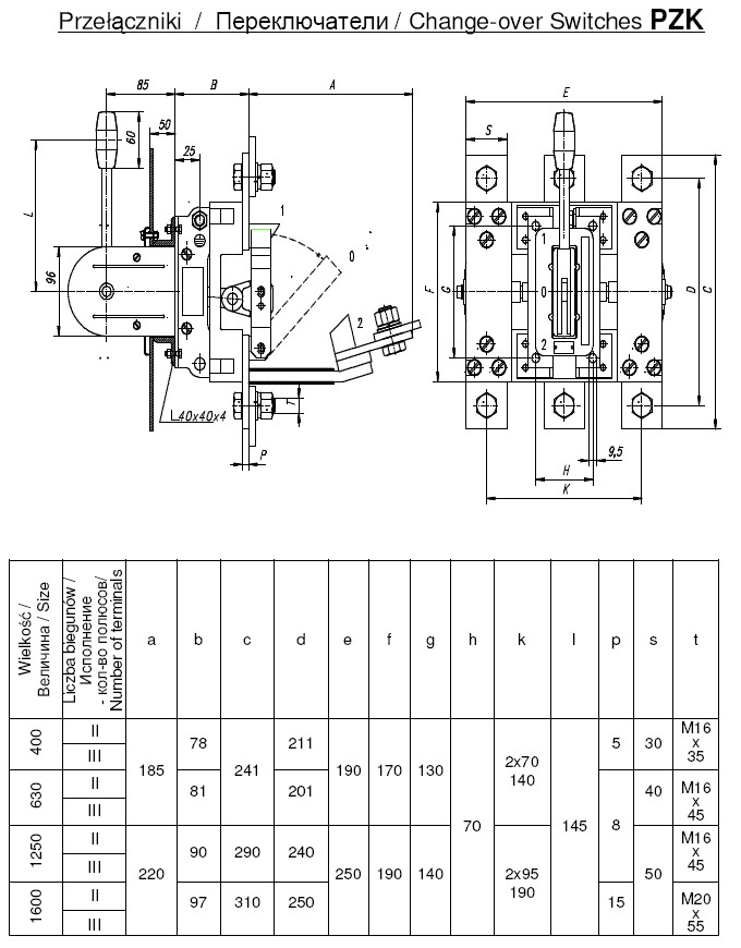 | Typ odłącznika | PZK-400 | PZK-630 | PZK-1250 | PZK-1600 | |