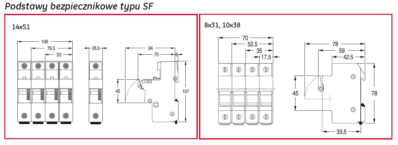 Podstawy modułowe serii SF z linii produktów Redline General Electric to seria odłącznikowych podstaw bezpiecznikowych przeznaczonych do zabezpieczenia instalacji, urządzeń elektrycznych przed skutkami zwarć i przciążeń. Stosowane są w instalacjach przemysłowych, które wymagają dużych zdolności wyłączalnych. Podstawy bezpiecznikowe spełniają funkcję odłącznika izolacyjnego. Zabezpieczają przed dotykiem zgodnie z normami IEC, stopień ochrony IP20. Przeznaczone są do stosowania z bezpiecznikami cylindrycznymi 8.5x32 mm, 10x38 mm, 14x51mm i 22x58mm.
