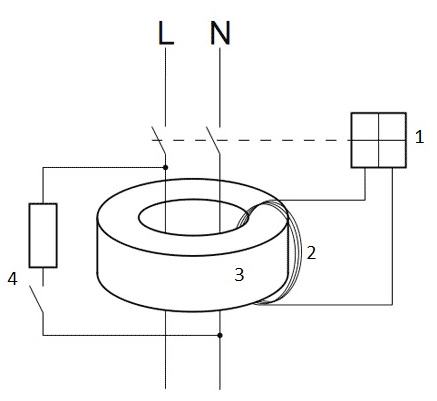 Wyłącznik róznicowoprądowy porównuje prądy płynące w przewodach zasilających, które przechodzą przez jego przekładnik prądowy – w normalnych warunkach ich sumaryczne, całkowite lub chwilowe wartości są równe zeru. Wewnątrz rdzenia przekładnika sumującego indukowany jest strumień magnetyczny z przewodów czynnych, których wektorowa suma wartości chwilowych wynosi zero. W przypadku awarii (np. przebicia izolacji) pewna część prądu zaczyna płynąć na zewnątrz przewodów pod napięciem, co przekłada się na brak zbilansowania wartości prądów. Tym samym dochodzi do wzbudzenia odpowiedniego strumienia magnetycznego wewnątrz rdzenia przekładnika. Jego uzwojenie wyjściowe generuje prąd aktywujący przekaźnik wyzwalający zadziałanie styków (wyłączników). Dodatkowo, każda różnicówka wyposażona jest w dostępny dla użytkownika przycisk testowy, umożliwiający kontrolę poprawności działania wyłącznika. Jego działanie polega na wymuszeniu przepływu prądu różnicowego poprzez włączenie w obwód rezystora.