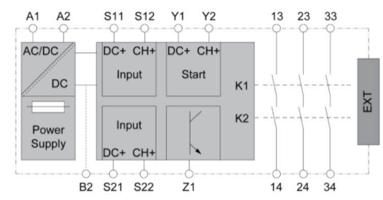 Typowa konstrukcja przekaźnika bezpieczeństwa wykorzystuje kombinację 3 styczników w celu zwiększenia redundancji i niezawodności układu. Za przełączanie odpowiadają dwa przekaźniki K1 oraz K2 ze stykami sterowanymi potencjałem dodatnim. Są one wzbudzane przez jeden z dwóch obwodów wejściowych S11/S12 i S21/S22. O zadziałaniu tych obwodów decyduje nie tylko sygnał podany na ich zaciski, ale również tzw. sygnał Start. Między jego zaciskami Y1 i Y2 istnieje obwód monitorujący, który sprawdza położenia aktuatorów oraz pozwala na włączanie lub wyłączanie ich za pośrednictwem styków bezpieczeństwa.