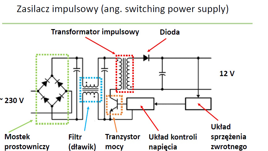 Schemat działania zasilacza impulsowego przedstawia się w uproszczeniu następująco. Napięcie przemienne z sieci energetycznej (230V) jest prostowane w prostowniku (zwykle w układzie Graetza – zbudowanego z czterech diod prostowniczych) a następnie filtrowane przez dławik i kondensatory, co zapobiega przedostawaniu się zakłóceń elektromagnetycznych do sieci. Wyprostowane w ten sposób napięcie zostaje przetworzone na przebieg zmienny o odpowiedniej częstotliwości i zmiennym współczynniku wypełnienia. Wytworzony przebieg jest następnie filtrowany, w efekcie czego otrzymujemy stałe napięcie, którego wartość zależy od współczynnika wypełnienia impulsów. Układ sprzężenia zwrotnego steruje układem PWM (Pulse Width Modulation) tak, aby przy zmieniającym się obciążeniu lub zmianach napięcia w sieci utrzymywać stałą wartość napięcia wyjściowego.