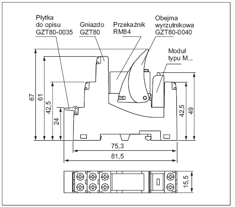 • PI-84 z gniazdem GZT80 lub GZM80 przeznaczone są do montażu na szynie 35 mm lub na płycie przy pomocy 1 wkręta M3