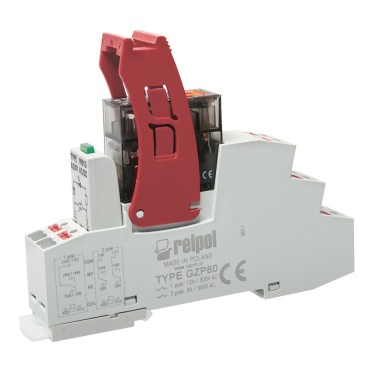 Przekaźnik interfejsowy PUSH-in (zestaw: przekaźnik RM84P, gniazdo push-in GZP80). Zestyki: 2P (przełączne). Obciążalność AC1 – 8 A/250 V AC. Znamionowe napiecie zestyków 250 V AC. Cewki AC lub DC. |
