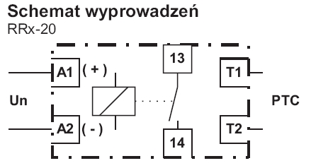 Zestyk wyjściowy 13 i 14 jest zamknięty, kiedy jest podłączony sprawny obwód czujników PTC, temperatura kontrolowana przez te czujniki jest prawidłowa oraz podłączone jest napięcie zasilajace. Jeżeli temperatura dowolnego czujnika przekroczy wartość znamionową jego rezystancja, czyli rezystancja całej pętli czujników PTC, gwałtownie wzrośnie do wartości powyżej 3800 ± 200Ω. Wówczs zestyk 13 i 14 jest otwarty.