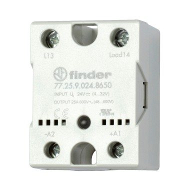Przekaźniki SSR serii 77.x5 (77.25..., 77.45... i 77.55...) firmy Finder to jednofazowe przekaźniki półprzewodnikowe, przeznaczone do montażu na panel. Załączanie w zerze. Wejście sterujące AC (77.x5.8...) lub DC (77.x5.9...). Znamionowy prąd obciążenia 25-50A. Maksymalne napięcie obciążenia wynosi 280V lub 660V AC. Przekaźniki posiadają zaciski śrubowe. Wyposażome są w zielony wskaźniki LED. Przekaźniki serii 77.x5 mają zastosowanie w przemyśle i infrastrukturze w trudnych warunkach użytkowania i przy dużym obciążeniu, wytrzymują częste przełączanie np. w systemach oświetlenia, do sterowania grzałkami, grzejnikami, cewkami zaworów i styczników, w układach automatyki przemysłowej oraz ze względu na bezgłośną pracę w obszarach wrażliwych na hałas. Obudowa z osłoną IP20.