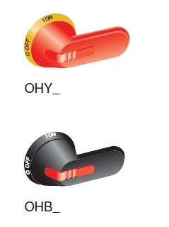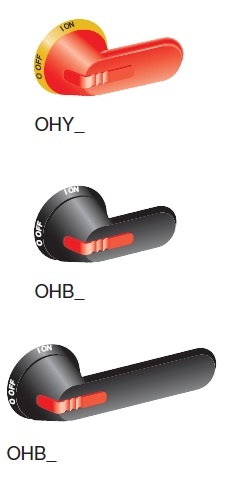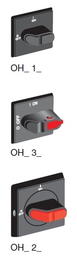 Rączki OH_: IP 65, z możliwością blokowania przy pomocy maksymalnie trzech kłódek w pozycji OFF, blokada drzwiczek w pozycji ON. Śruba mocująca na tylnej stronie rączki. Brak śrub z przodu zapewnia podwójną izolację.