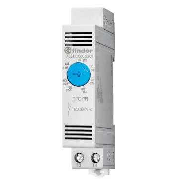 Termostaty i higro-termostaty serii 7T firmy Finder to modułowe (szerokość 17,5mm), kompaktowych rozmiarów aparaty służące do sterowania w układach regulacji temperatury w szafach rozdzielczych i sterowniczych. Zapewniają prawidłowe działanie komponentów w rozdzielnicach i mogą wydłużyć żywotność systemu sterowania. Kontrola grzałek - kiedy temperatura wewnątrz szafy spadnie poniżej nastawionej, zestyk zewrze się załączając obwód grzałek. Zestyk rozewrze się kiedy temperatura osiągnie poziomminimum. Ogrzewanie: czerwone pokrętło. Kontrola wentylacji - kiedy temperatura przekroczy nastawiony próg zestyk zewrze się załączając obwód chłodzenia. Zestyk rozewrze się kiedy temperatura spadnie poniżej nastawionego progu. Wentylacja: niebieskie pokrętło.