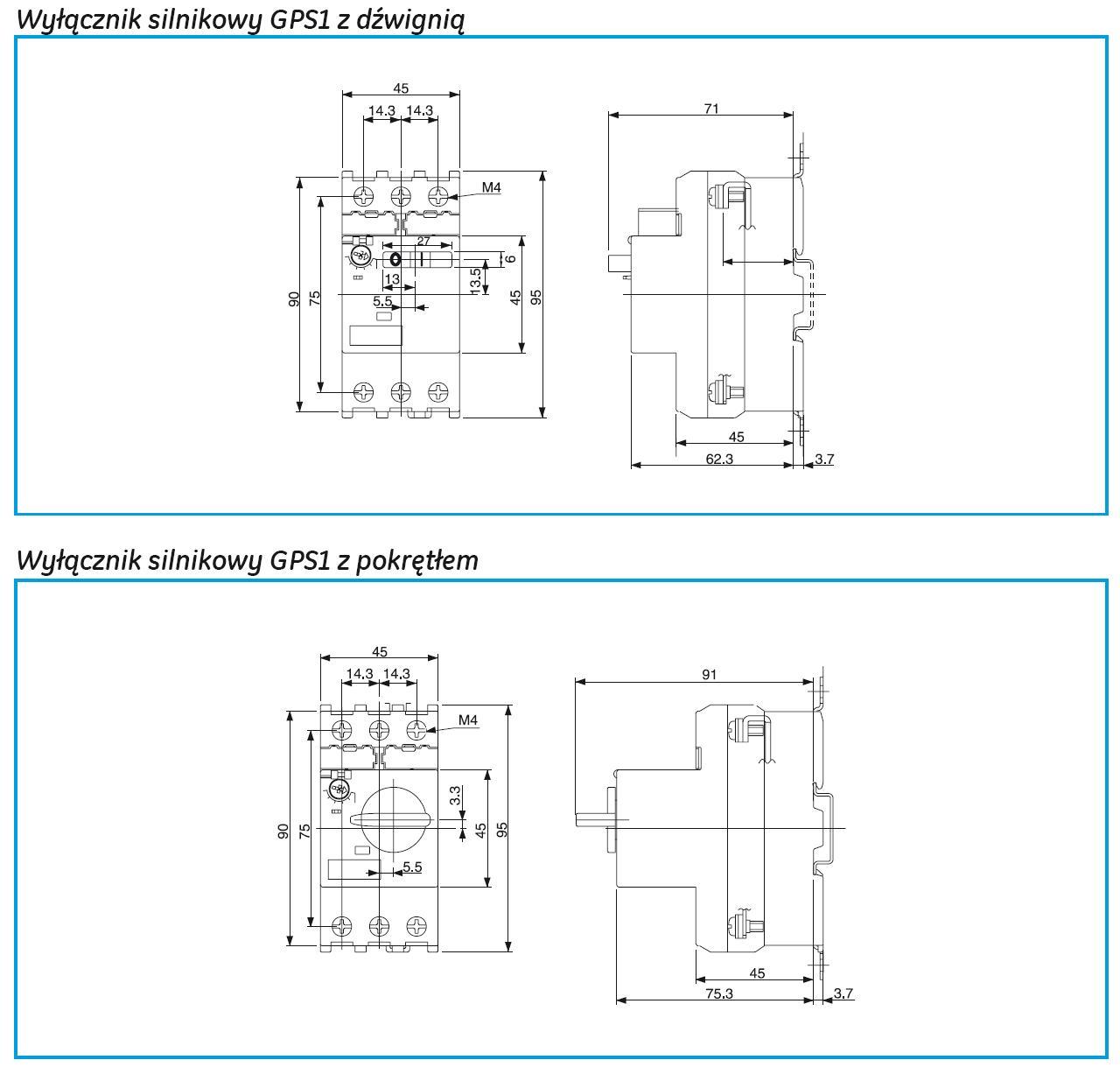 Wyłączniki silnikowe GPS1 przeznaczone są głównie do zabezpieczania silników elektrycznych przed skutkami zwarć, przeciążeń i pracą niepełnofazową ( zabezpieczenie termiczne i magnetyczne). Obudowa szerokości 45 mm z dwoma różnymi mechanizmami załączania: przy pomocy dźwigni dla zastosowań tradycyjnych wymagających standardowej zdolności zwarciowej(GPS1*S) oraz z pokrętłem (GPS1*H) dla zastosowań o podwyższonej zdolności zwarciowej.