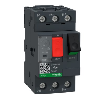 GV2ME - seria 3-fazowych wyłączników silnikowych przeznaczonych do ochrony i kontroli silników o mocy do 15 kW/400V w 15 zakresach prądowych od 0,10 do 32 A. Wyłaczniki zabezpieczają silniki przed skutkami zwarć i przeciążeń oraz umożliwiają sterowanie pracą silnika przy pomocy przycisków. Zabezpieczają urządzenia przed ich zniszczeniem wskutek blokady rozruchu, zwarcia lub braku czy asymetrii napięcia.