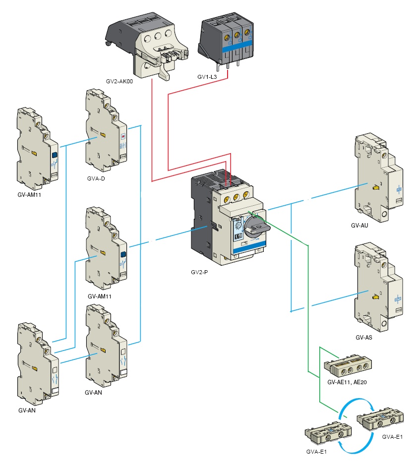 Dużą zaletą wyłaczników GV2 jest możliwość modyfikowania i rozbudowywania styków, wyzwalaczy pomocniczych napięciowych i podnapieciowych, łączników, bloków sygnalizacyjnych, mechanizmu napędowego na drzwi itp.