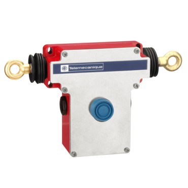 Dwustronne wyłączniki bezpieczeństwa XY2CED firmy Telemecanique Sensors to linkowe wyłączniki cięgnowe zatrzymania awaryjnego z blokadą, przeznaczone do pracy w układach kontrolno-sterowniczych bezpieczeństwa maszyn. Służą do monitorowania i bezpiecznej ochrony osób oraz instalacji technicznych i zapewniają możliwość wyłączenia maszyny w najwcześniejszym możliwym momencie gdy nie działa normalna funkcja wyłączenia maszyny. Wyłączniki linkowe z cięgnem pozwalają w dowolnym miejscu stanowiska roboczego zatrzymać maszynę lub proces produkcyjny, poprzez pociągnięcie cięgna wyłącznika za pomocą linki rozciągniętej wzdłuż stanowiska roboczego. Wyłączenie następuje również w przypadku zerwania linki bezpieczeństwa. Pasiadają dwa punkty zaczepienia cięgna roboczego, z prawej i lewj strony wyłacznika. Urządzenia wyposażone są w niebieski przycisk kasowania ręcznego. Wyłączniki linkowe zatrzymania awaryjnego serii XY2CED mogą być stosowane do rozwiązań z linką bezpieczeństwa o maksymalnej długości do 2x70 m (po 70m z prawej i lewej strony wyłącznika). Wykonane są w metalowej obudowie z Zamaku, w kolorze czerwonym, z metalową nierdzewną pokrywą w kolorze szarym. Akcesoria do montażu jak linki, wsporniki, śruby rzymskie i sprężyny końcowe należy zamawiać oddzielnie.