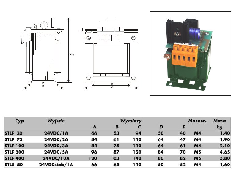 Zasilacz STLF to zasilacz transformatorowy zbudowanny na bazie transformatorów STM z wyjściem DC przeznaczony do wbudowania w przemysłowych instalacjach i urządzeniach automatyki. Zasilacze posiadają układ filtracji (typ STLF) lub stabilizacji (typ STLS).